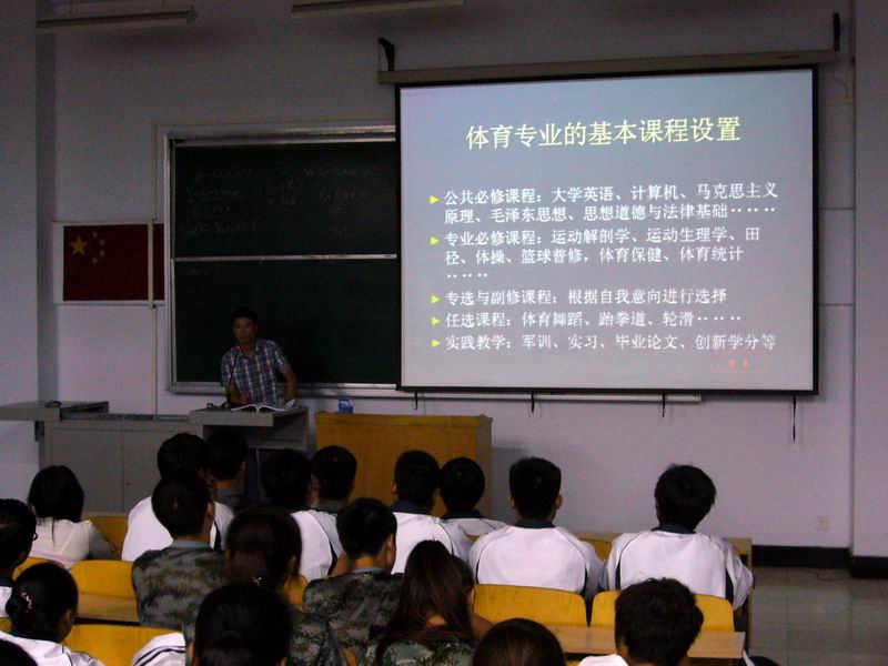 2012年9月10日、11日晚,太阳成集团tyc122cc新生入学教育活动之《体育专业介绍》、《专业培养方案和课程设置》主题讲座在A合四教室隆重举行。太阳成集团tyc122cc副经理吴洁和教学秘书刘旭东分别担任主讲,侯凯老师和2012级的全体新同学聆听了讲座。