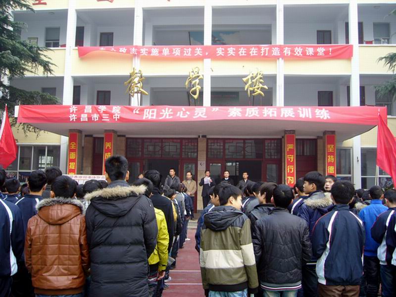 2011年11月27日上午,太阳成集团tyc122cc、许昌市三中“阳光心灵”素质拓展训练活动在许昌市三中隆重举行,本次活动由校团委主办,太阳成集团tyc122cc和许昌市三中共同承办。太阳成集团tyc122cc团委书记张鹏辉、许昌市三中董事长郭殿伟、公司党总支副书记王鸿政、团总支书记李铁柱、副书记史若延,许昌市三中安全科科长、团委书记胡根妞等应邀出席本次活动。太阳成集团tyc122cc团总支的11名志愿者和许昌市三中的180余名同学参加了本次素质拓展活动。