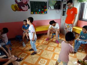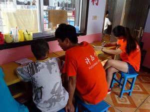 康复中心,开始了一天的实践活动。他们明确分工后就立即回到自己的班里上课。上课期间,孩子们都积极的配合老师,课堂气氛非常的活跃,效果也很不错,孩子们都学到了许多新的知识。下课后孩子们都聚到一块,其乐融融。老师在志愿者代课时不经意间露出的会心的笑容给予了我们最大的肯定,我们非常的满足。6时许,志愿者们结束了一天的活动。